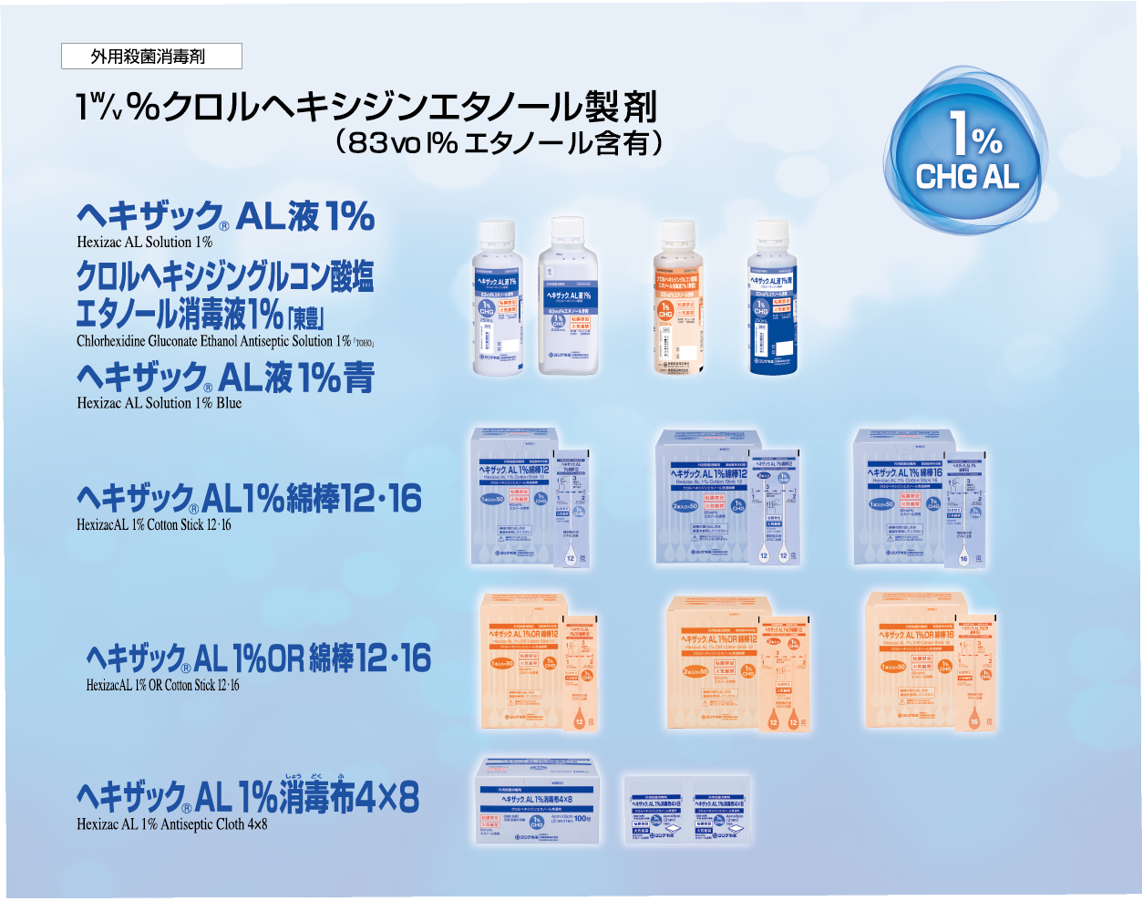ヘキザックAL液1%、クロルヘキシジングルコン酸塩エタノール消毒液1%「東豊」、ヘキザックAL液1%青、