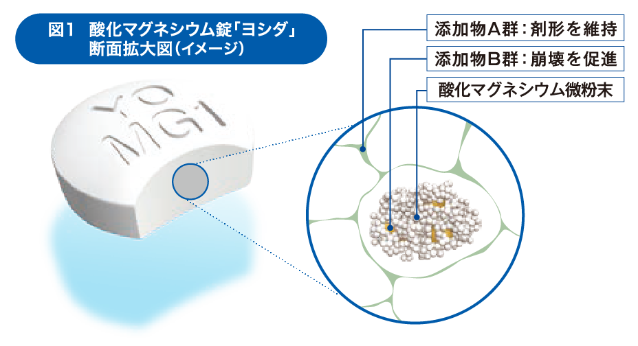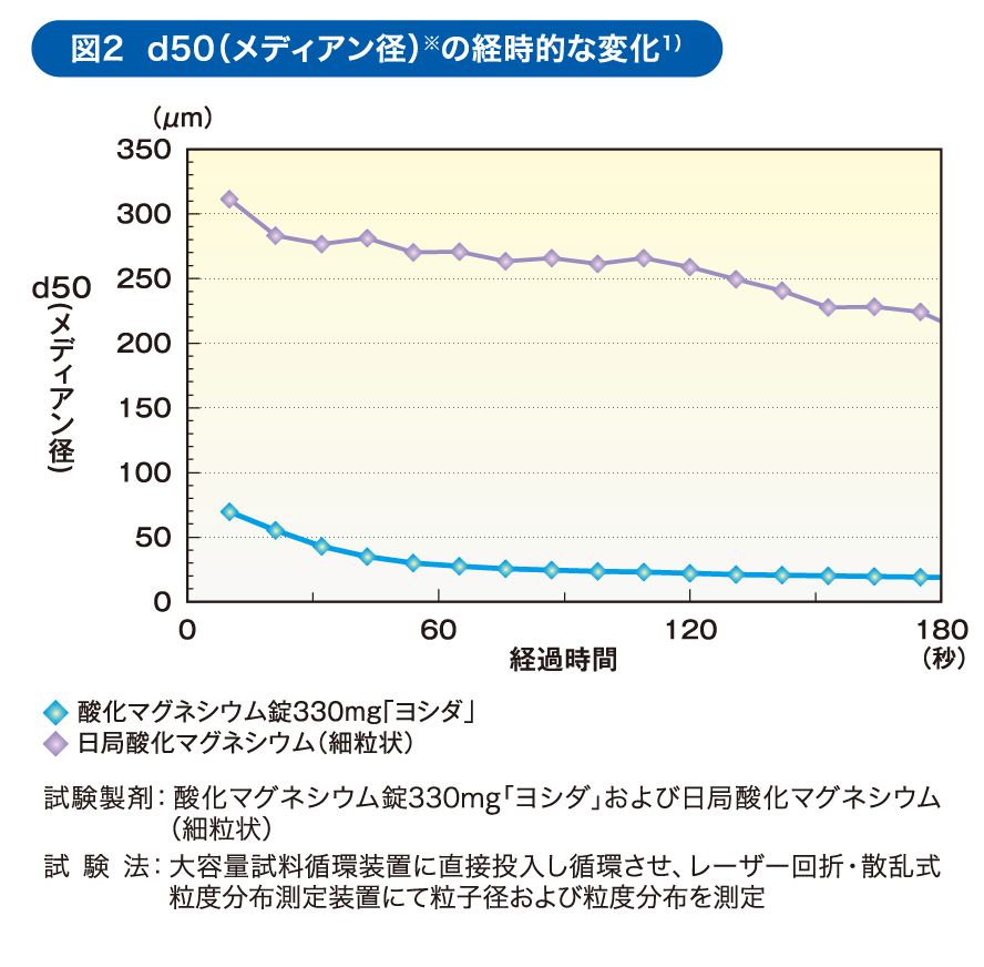 1) 吉田製薬株式会社社内資料:酸化マグネシウム錠「ヨシダ」の水中における経時的な粒子径の変化-日局酸化マグネシウム(細粒状)との比較-