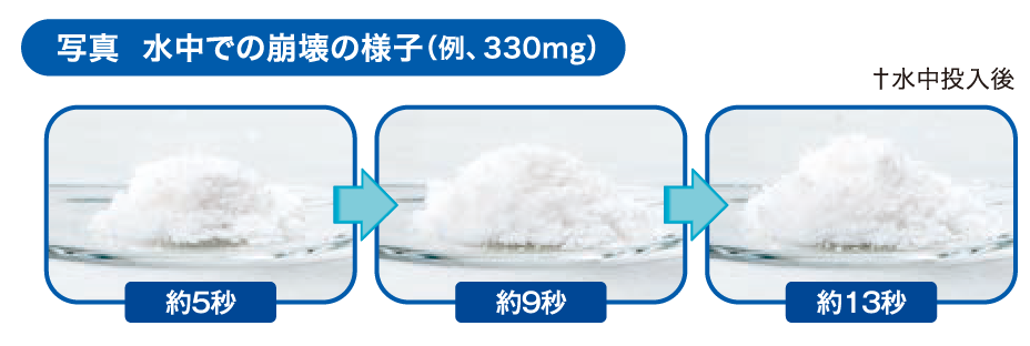 水中での崩壊促進能力に優れており、錠剤を水中に投入すると、剤形は速やかに崩壊し、微粒子状になります(図2、写真)。