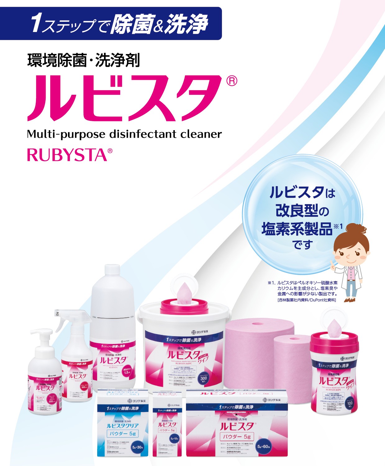 ルビスタパウダー、ルビスタクリアパウダー、ルビスタ ワイプ、 ルビスタ スプレーボトル500mL用、ルビスタ 調製ボトル1.5L用、ルビスタ フォーマーボトル500mL用