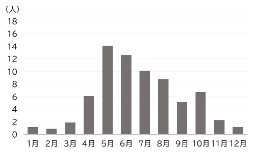 SFTSは2011年に中国の研究者らによって初めて報告され2)、日本においても2013年に最初の患者が山口県で報告されています3)。日本では例年4月頃から患者が増えはじめ5~6月頃をピークに10月頃まで患者発生数が多い状況が続く傾向がみられます(図1)。発症者の男女比はほぼ1:1で、発症年齢の中央値は74歳で主に60歳以降の患者が多いですが、20代や30代での発症例もあり4)、致死率は5~40%と高い感染症です1)。SFTSは感染症法では四類感染症に指定されており、全数把握の対象疾患です。そのため、SFTSと診断した場合は最寄りの保健所に直ちに届出を行う必要があります。診断に必要な検査としては血液や咽頭拭い液等のPCR検査、血清のELISA法等によるウイルス抗体検査があります。