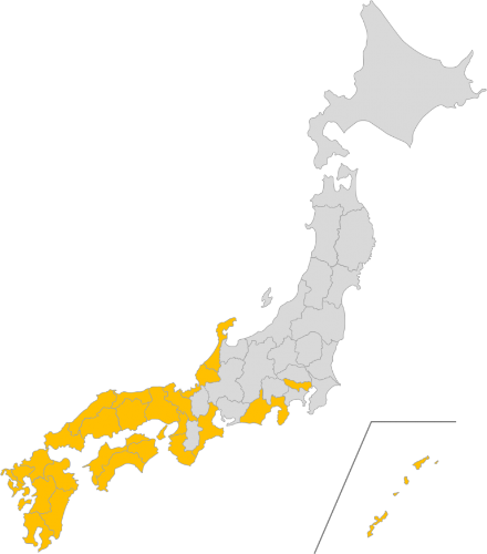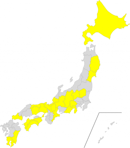 黄色:SFTSウイルス遺伝子検出地域(国立感染症研究所のデータ8)を基に作成)