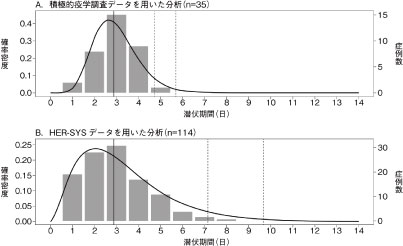 国立感染症研究所にて、実地疫学調査および新型コロナウイルス感染者等情報把握・管理支援システム(HER-SYS) のデータを用いて、オミクロン株の潜伏期間の推定を行い、その暫定結果について報告されています9)。実地疫学調査データを用いたオミクロン株症例の潜伏期間の中央値は2.9日(95%CI:2.6‐3.2)であり、曝露から6.7日以内に99%の症例が発症していました(図1, A)。またHER-SYSのデータを用いた解析では、潜伏期間は2.9日(95%CI:2.5‐3.2)で実地疫学調査と同程度であり、感染曝露から95%および99%の症例で発症するまでの日数はそれぞれ7.1日、9.7日と報告されています(図1, B)。