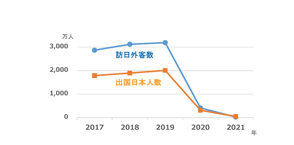 これまでの訪日外客数および出国日本人数は年々増加傾向にあり、パンデミック直前の2019年の訪日外客数は約3200万人、出国日本人数は約2000万人でした。しかし、パンデミック宣言後の2020年は訪日外客数が約411万人、出国日本人数は約317万人と前年比で80%以上の減少となり、2021年は更に減少し、訪日外客数は約25万人、出国日本人数は約51万人でした(図1)4)5)。