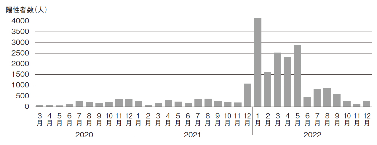 新型コロナウイルス感染症の水際対策として、空港における検疫が実施されています。2020年3月~2022年12月までの空港検疫における新型コロナウイルス感染症の陽性者数を図3に示します10)。世界的流行による感染者数の増加に伴い空港検疫における陽性者数も変動し、ピーク時は1ヵ月に4000件を超える陽性者数となっておりました。2022年12月時点における陽性者検出状況は、検出数はピーク時よりも大幅に減少してはいますが、他の輸入感染症にくらべると多い状況が続いています。