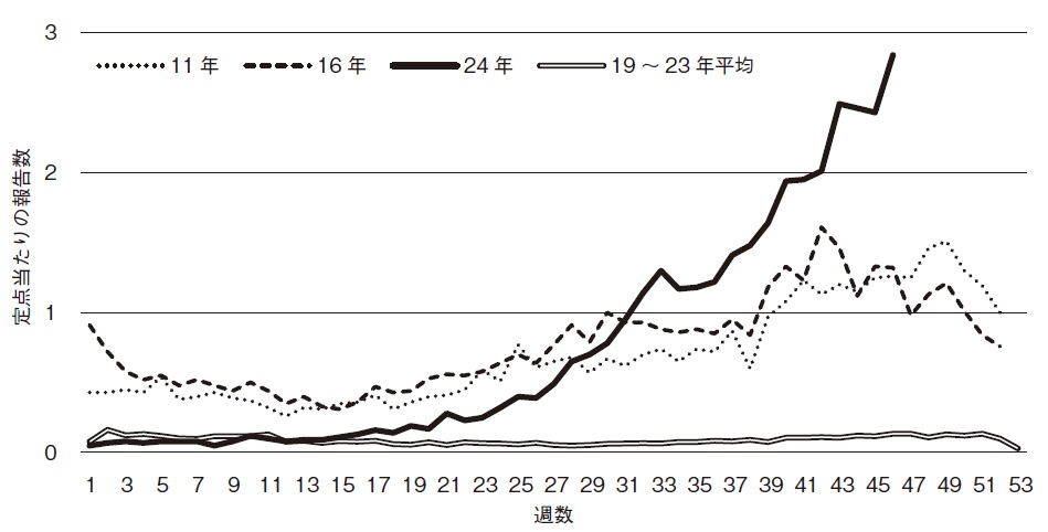 出典:IDWR感染症週報(https://www.niid.go.jp/niid/images/idsc/idwr/IDWR2024/idwr2024-35.pdf 国立感染症研究所)のデータをもとに作成