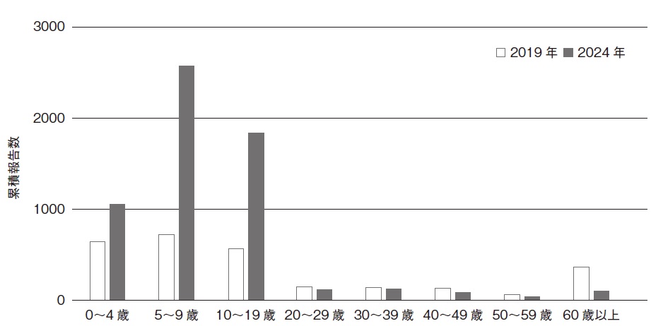 図2 2019年と2024年におけるマイコプラズマ肺炎の累積報告数の年齢分布(第1~35週時点)