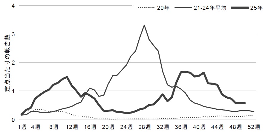 日本においても2020年はほとんど患者の発生がありませんでしたが、2021年以降は流行がみられています。また、流行の時期については、COVID-19流行前では夏季から増加傾向となり秋季にピークとなる傾向がみられていましたが、2021~24年までの4年間の各週の定点報告数を平均すると夏季の報告数が多い状態であったのに対し、冬季は低い状態が続いていました。しかし、2025年は夏季の報告数が少なかった一方で、夏季以降に報告数が増加し、秋季以降もここ数年に比べると高い状態が続いています(図1)。